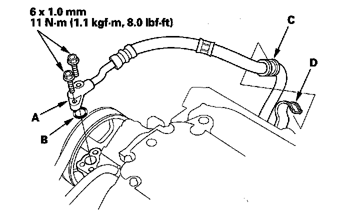 68. Install the power steering pump outlet line (A) with the new O-ring (B) to the pump, and install the hose (C) in its clamp (D).