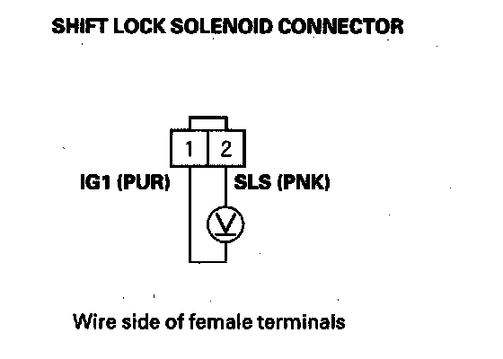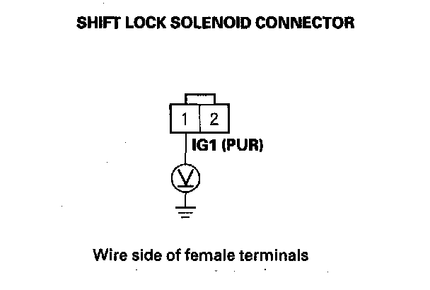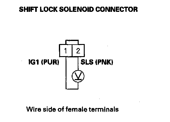 9. Release the brake pedal, and measure the voltage between the shift lock solenoid connector terminals No. 1 and No. 2. The shift lever must be in P.
