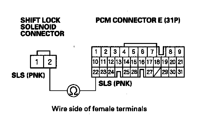 13. Check for continuity between the PCM connector terminal E22 and shift lock solenoid connector terminal No. 2.