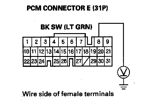 18. Measure the voltage between PCM connector terminal E8 and body ground while pressing the brake pedal and when the brake pedal is released.