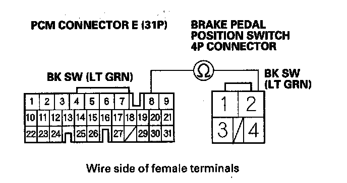 19. Check for continuity between the PCM connector terminal E8 and brake pedal position switch 4P connector terminal No. 2.