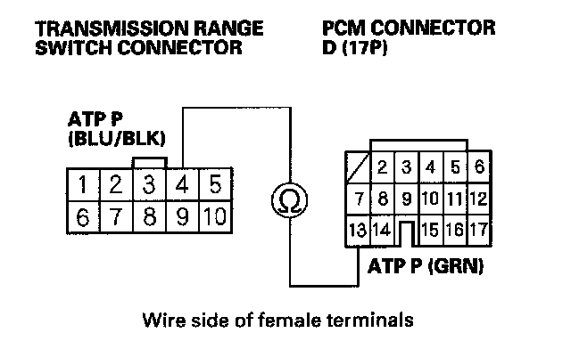 27. Check for continuity between the PCM connector terminal D13 and transmission range switch connector terminal No. 4.