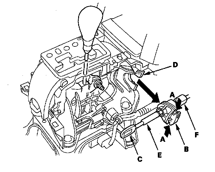 4. Press the holder lock release (A), and pull out the socket holder (B) to remove the shift cable (C) from the shift lever bracket base (D). Do not remove the shift cable by pulling the shift cable guide (E) and damper (F).
