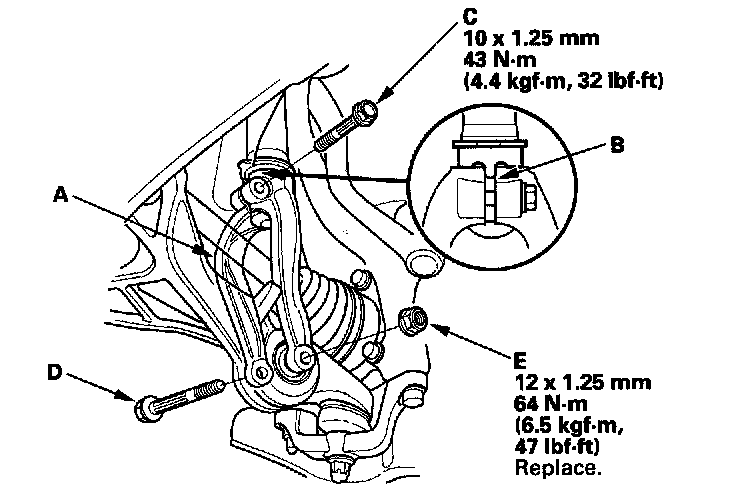 8. Loosely install the flange bolt (D) and a new self locking nut (E).