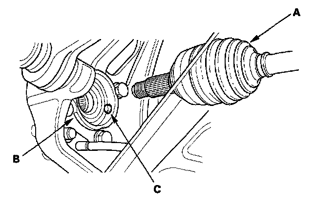 4. Clean the areas where the driveshaft contacts the differential thoroughly with brake cleaner, and dry with compressed air. Do not wash the rubber parts in solvent. Insert the inboard end (A) of the driveshaft into the differential (B) until the set ring (C) locks in the groove (D).