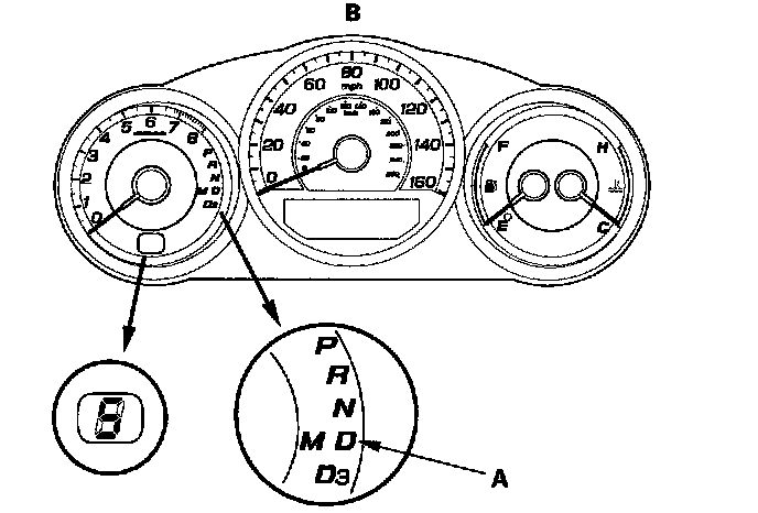 When the PCM senses an abnormality in the input or output system, the D indicator (A) in the gauge control module (B) will usually blink.