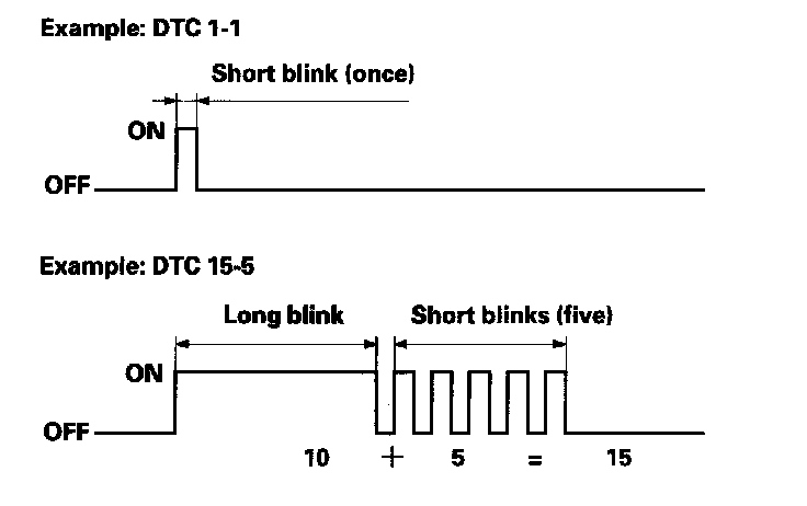 2. Turn the ignition switch to ON (II), select SCS mode, then observe the D indicator in the gauge control module. Codes 1 through 9 are indicated by individual short blinks. Code 10 and above are indicated by a series of long and short blinks. One long blink equals 10 short blinks. Add the long and short blinks together to determine the code.