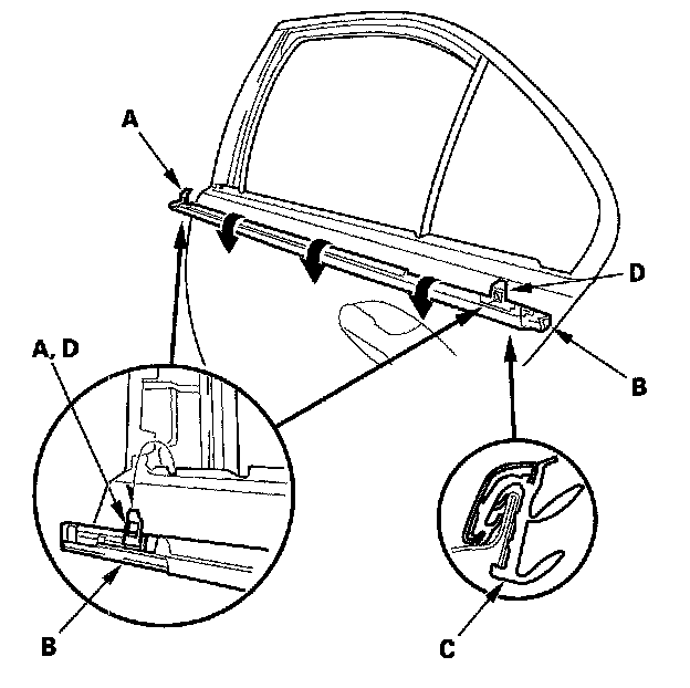 3. Starting at the front, detach the front clip (A), and pull the door glass outer weatherstrip (B) up at each portion where the inner molding (C) catches the inside edge of the window slot, and then detach the rear clip (D), then remove the weatherstrip.