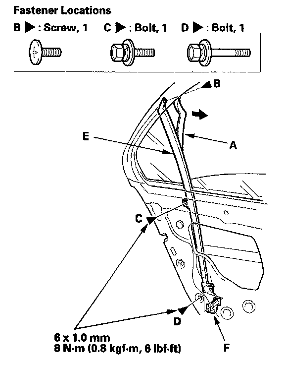 4. Pull the glass run channel (A) away as needed, then remove the screw (B). Remove the bolts (C, D) securing the center channel (E), then remove the collar (F).