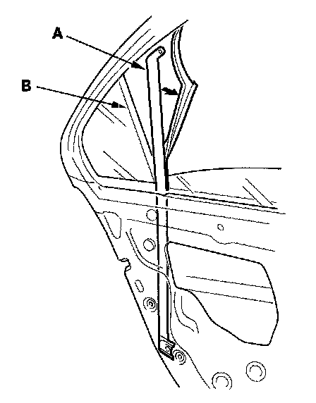 5. Pull the upper portion of the center channel (A) forward to remove it from the door quarter glass seal (B).
