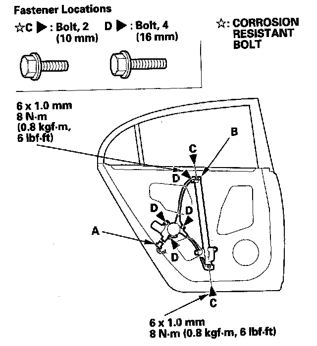 9. Remove the bolts (C), and loosen the bolts (D), then remove the regulator through the hole in the door.