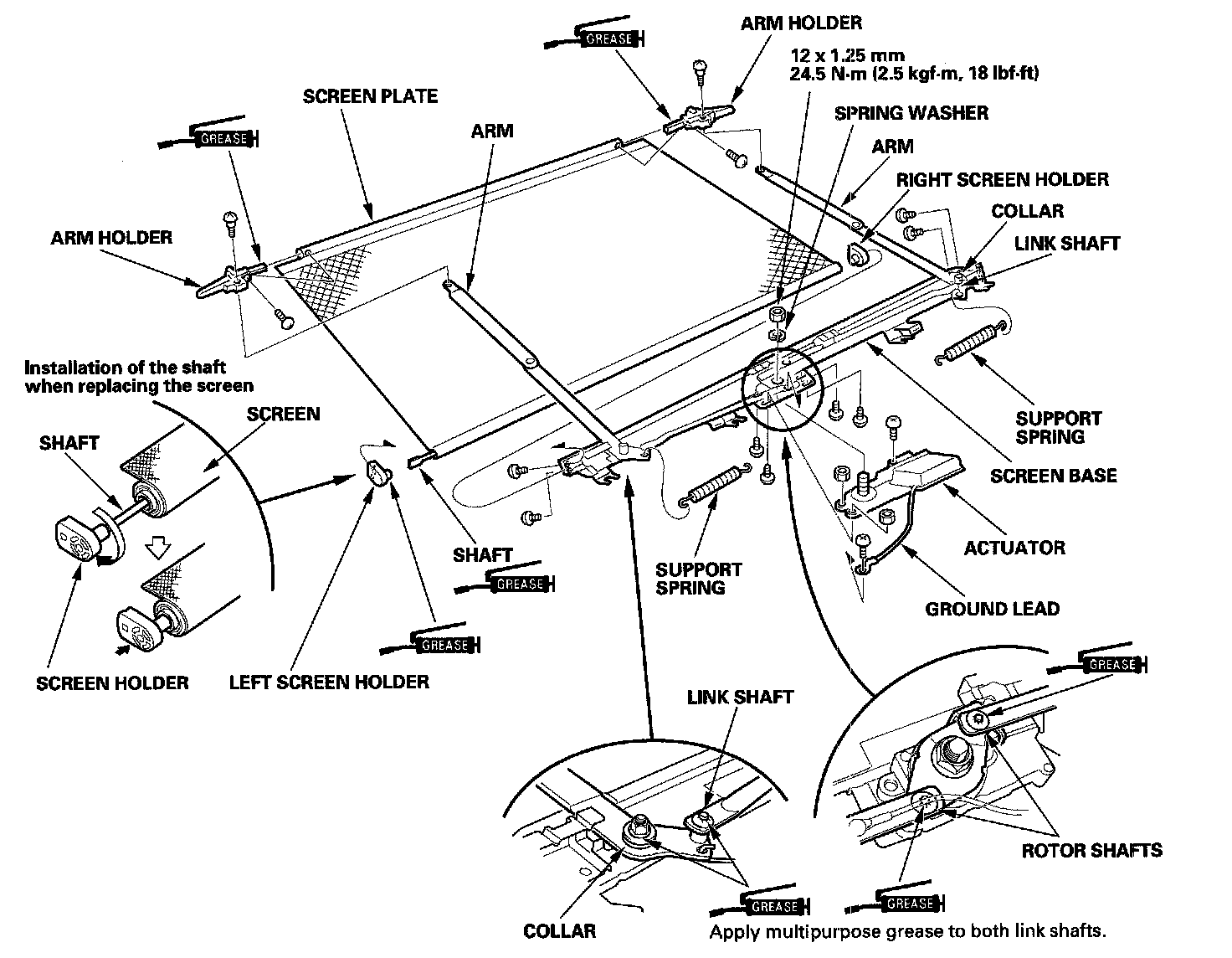 - Apply multipurpose grease to each pivoting portion of the sunshade as shown.