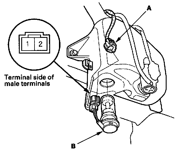 2. Disconnect the 2P connector (A) from the washer fluid level switch (B).