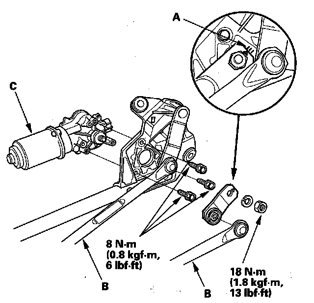 6. Scribe a line (A) across the link and windshield wiper linkage to show the original adjustment. Separate the windshield wiper linkage (B) from the wiper motor (C).