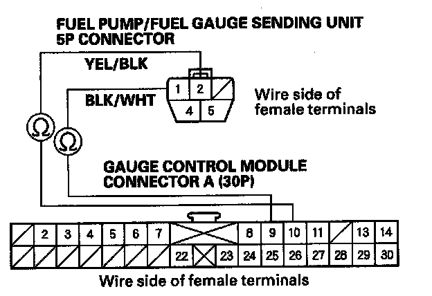 NO - Repair an open or loose connection in the BLK /WHT or YEL7BLK wire between the gauge control module connector A (30P) and fuel pump/fuel gauge sending unit 5P connector.