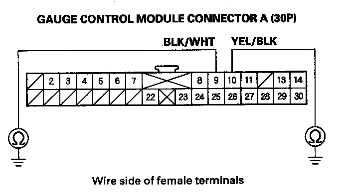 4. Check for continuity between gauge control module connector A (30P) No. 9 and No. 10 terminals and body ground individually.