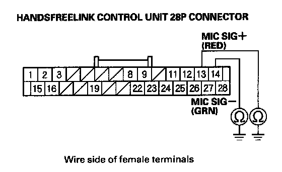 8. Check for continuity between body ground and HandsFreeLink control unit 28P connector terminals No. 13 and No. 14 individually.