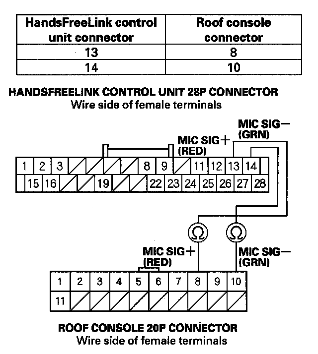 10. Check for continuity between HandsFreeLink control unit 28P connector and roof console 20P connector according to the table.