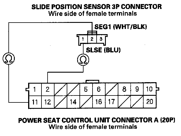 20. Check for continuity between power seat control unit connector A (20P) No. 1 and No. 11 terminals and slide position sensor 3P connector No. 3 and No. 2 terminals individually.