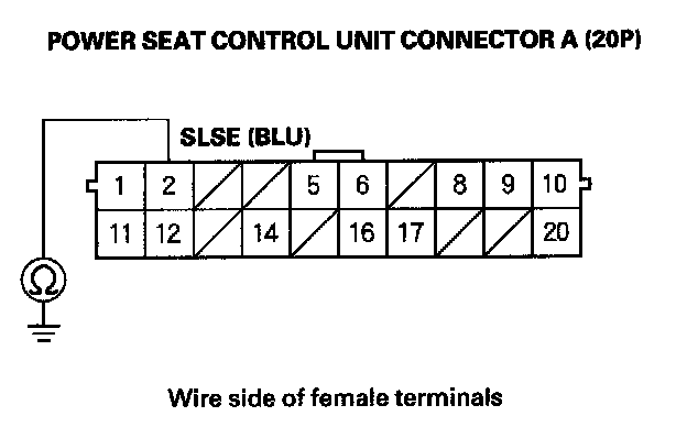 13. Check for continuity between power seat control unit connector A (20P) No. 2 terminal and body ground.