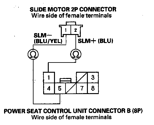 29. Check for continuity between power seat control unit connector B (8P) No. 1 and No. 5 terminals and slide motor 2P connector No. 2 and No. 1 terminals individually.