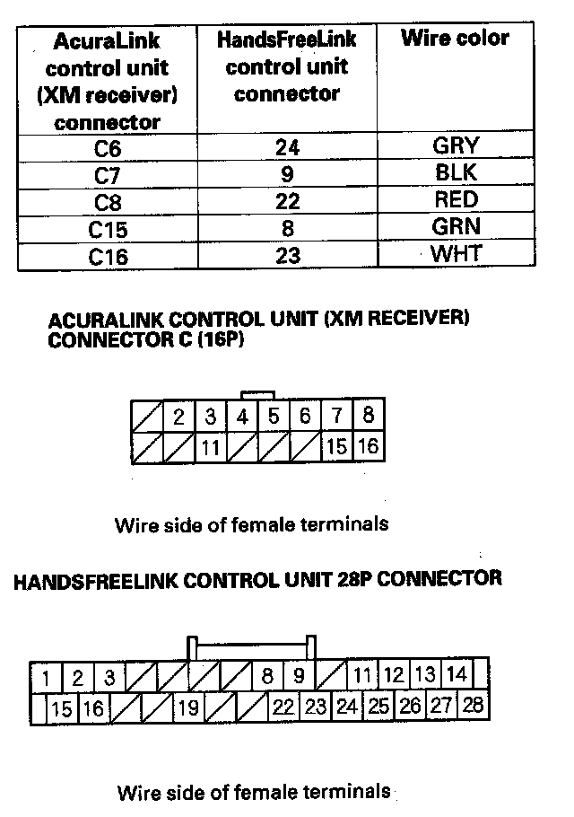 8. Check for continuity between AcuraLink control unit (XM receiver) connector C (16P) and the HandsFreeLink control unit 28P connector according to the table.