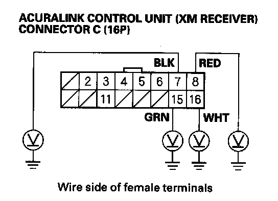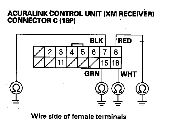 14. Measure the resistance between AcuraLink control unit (XM receiver) connector C (16P) terminals No. 7, No. 8, and No. 15, No.16.