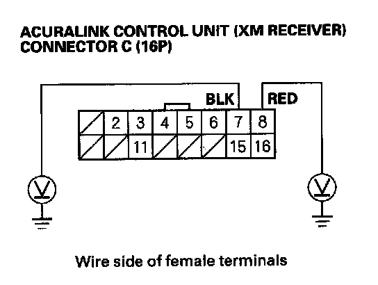 17. Measure the voltage between the body ground and the AcuraLink control unit (XM receiver) connector C (16P) terminal No. 7, No. 8 individually.