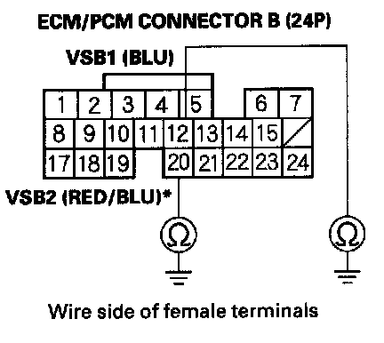 10. Check for continuity between ECM/PCM connector terminal B12 (B20)* and body ground.