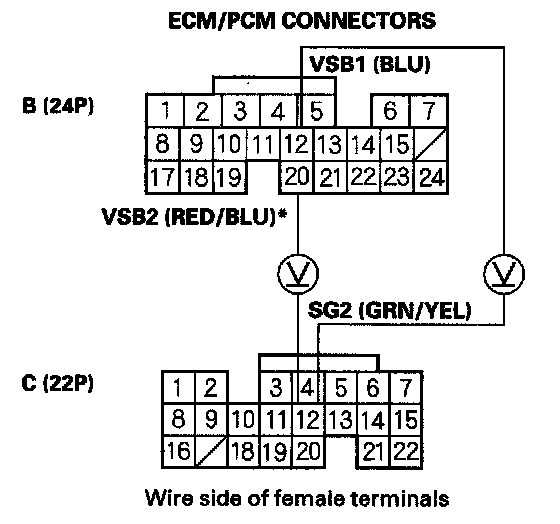 13. Measure voltage between ECM/PCM connector terminals B12 (B20)* and C12.