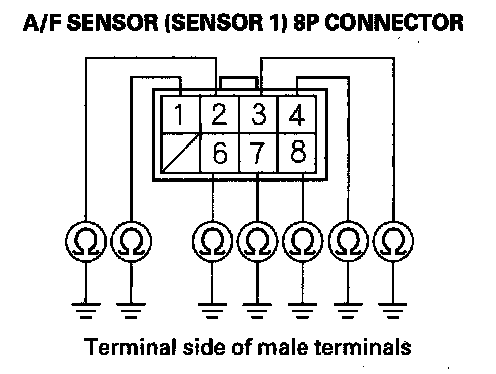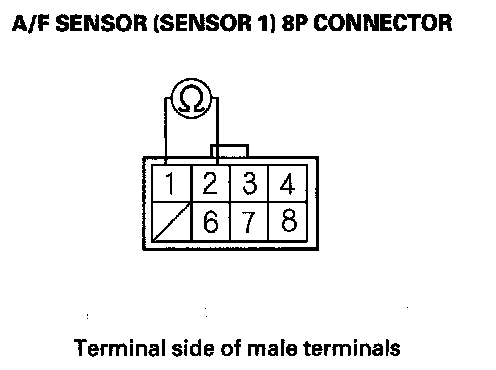 8. At the sensor side, measure resistance between A/F sensor (Sensor 1)8P connector terminals No. 1 and No. 2.