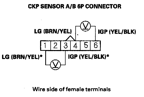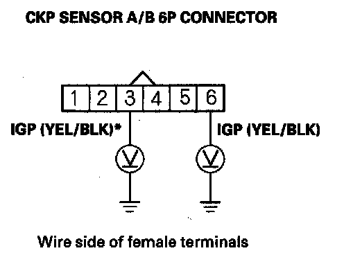 10. Measure voltage between CKP sensor A/B 6P connector terminal No. 4 (No. 1)* and No. 6 (No. 3)*.