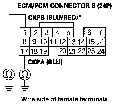 15. Check for continuity between ECM/PCM connector terminal B17 (B1)* and body ground.