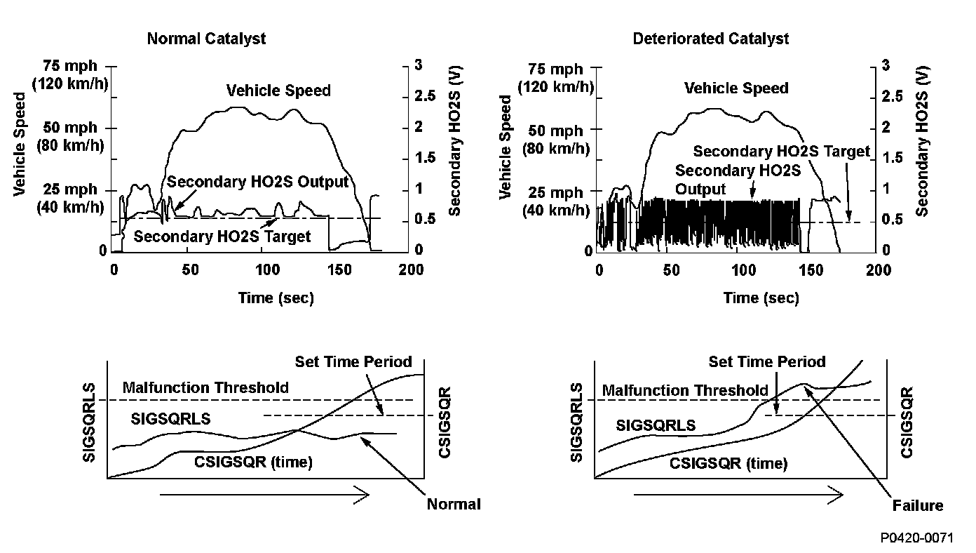 If the TWO deteriorates, the air/fuel ratio downstream of the TWO (the secondary HO2S output) often differs from the target secondary HO2S output, and the status is represented by the parameter (SIGSQRLS).