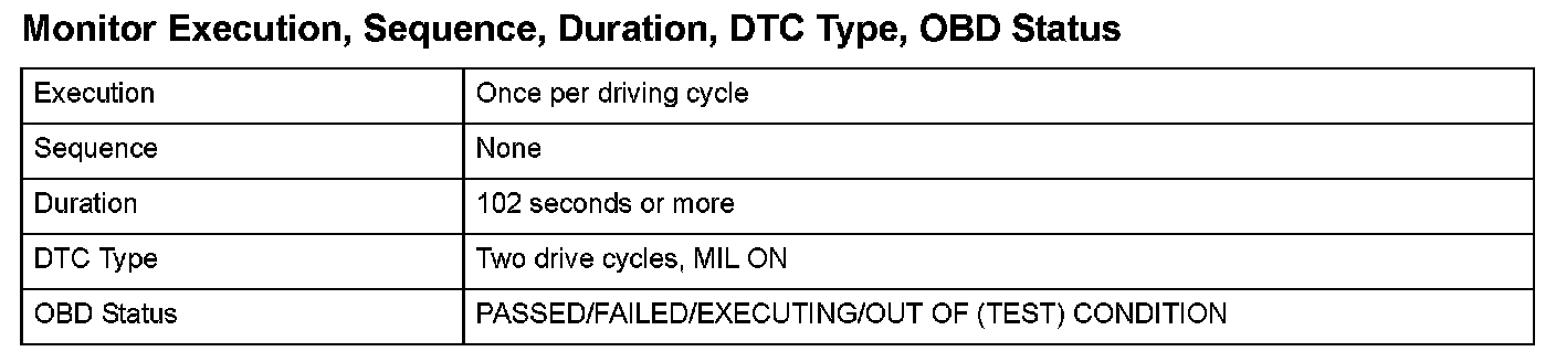 Monitor Execution, Sequence, Duration, DTC Type, OBD Status