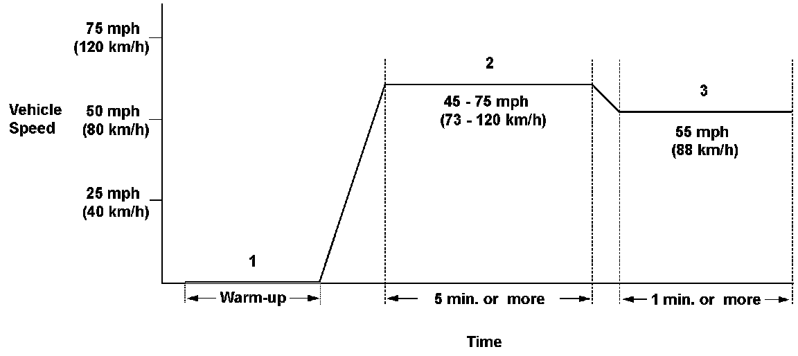 2. Drive the vehicle at a speed between 45 - 75 mph (73 - 120 km/h) for at least 5 minutes, to warm up the TWO.