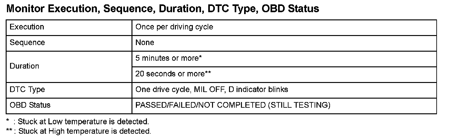 Monitor Execution, Sequence, Duration, DTC Type, OBD Status