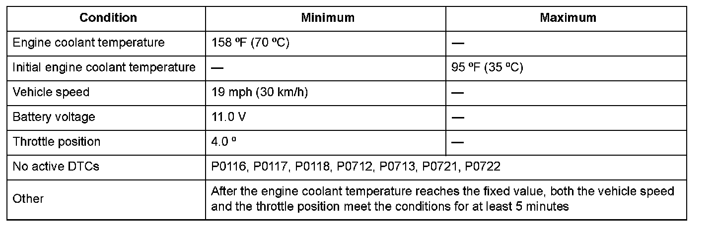 Start the engine with engine coolant temperature at 95 °F (35 °C) or less, and warm up the engine until the engine coolant temperature reaches 158 °F (70 °C) or more. Then drive the vehicle at a speed of 19 mph (30 km/h) or more with the throttle position at 4.0° or more for at least 5 minutes.