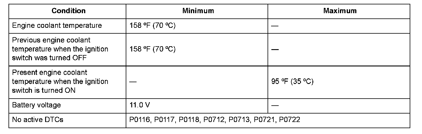 The ATF temperature drop is -9 °F (-5 °C) or less after the ignition switch is turned ON, and the current ATF temperature is 230 °F (110 °C) or more for at least 20 seconds.