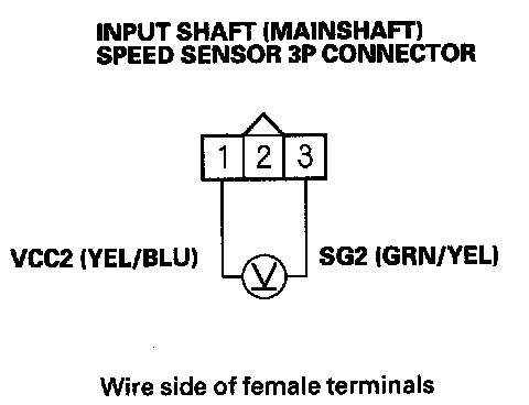 7. Measure voltage between input shaft (mainshaft) speed sensor 3P connector terminal No. 2 and body ground.