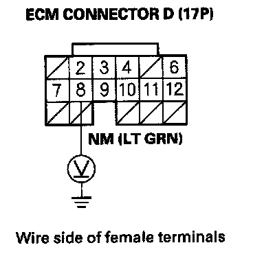 9. Measure voltage between ECM connector terminal D8 and body ground.