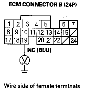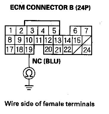 14. Check for continuity between ECM connector terminal B19 and body ground.