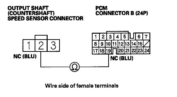 22. Check for continuity between PCM connector terminal B19 and output shaft (countershaft) speed sensor connector terminal No. 2.