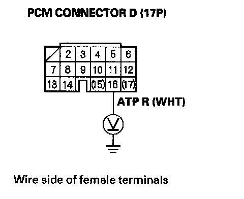 9. Measure the voltage between PCM connector terminal D16 and body ground.