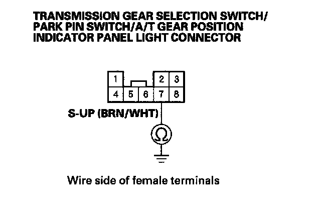 11. Check for continuity between transmission gear selection switch/park pin switch/A/T gear position indicator panel light connector terminal No. 7 and body ground.