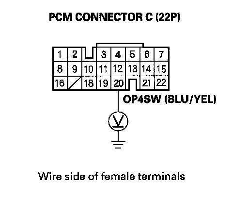 12. Measure the voltage between PCM connector terminal C20 and body ground.