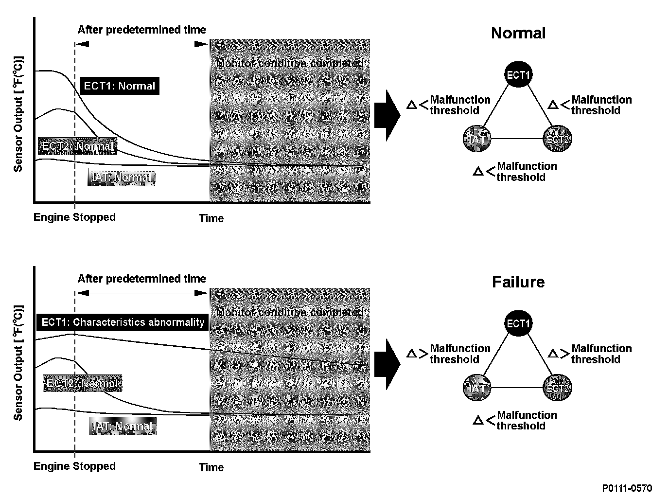 When the engine is stopped and enough time has passed, the temperature of the engine will equal the ambient temperature. When an inappropriate temperature is detected after comparing the temperature readings of each sensor, a malfunction in the corresponding sensor is detected and a DTC is stored.
