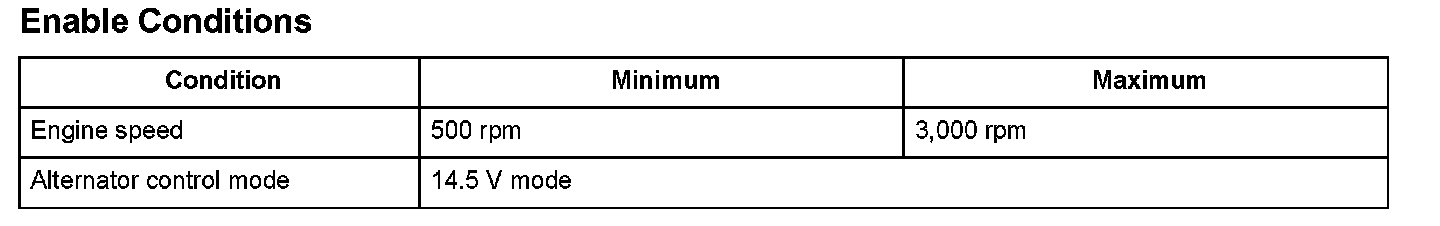 The alternator is driven by the engine, and it generates electricity to supply the necessary power to the electrical system and to charge the battery. The alternator voltage target values of 14.5 V and 12.5 V are achieved by switching the alternator control mode (controlled by the engine control module (ECM)/powertrain control module (PCM)). The alternator output signal is sent to the ECM/PCM, and it varies according to the battery's state of charge, the electrical load, and the engine speed. When the engine speed is a specified value and the IGP terminal voltage is below a set value when the alternator is in the 14.5 V mode, and the alternator power generation amount is within the set range, and this condition continues more than a set time, the ECM/PCM detects a malfunction and a DTC is stored.