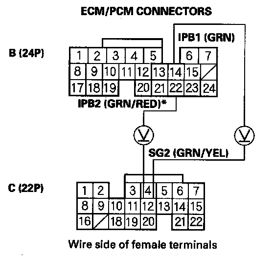 9. Check for continuity between ECM/PCM connector terminal B14 (B22)* and body ground.