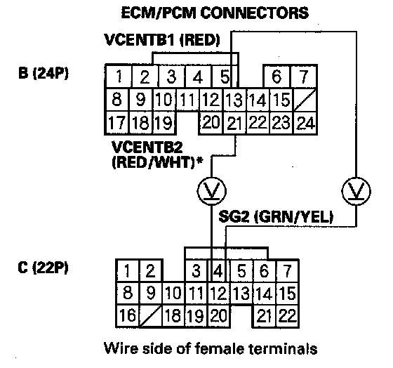 12. Measure voltage between ECM/PCM connector terminals B13 (B21)* and C12.